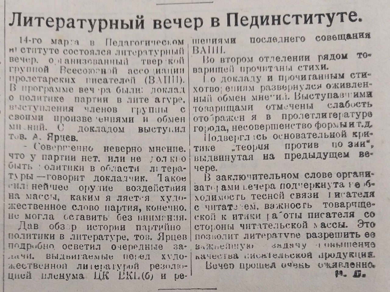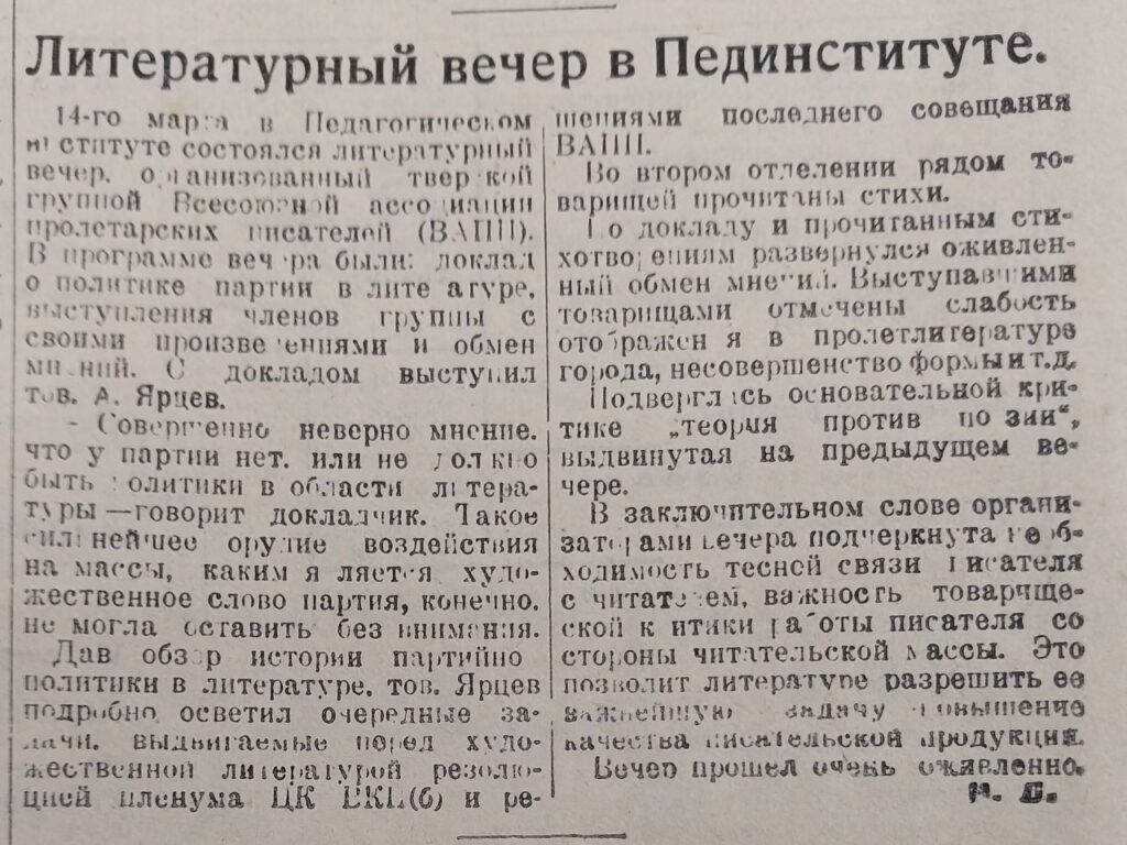 А 14 марта в пединституте состоялся литературный вечер, организованный тверской группой Всесоюзной ассоциации пролетарских писателей. После основного доклада о политике партии в литературе, писатели выступали со своими произведениями, читали стихи. По докладу и прочитанным стихотворениям развернулся оживленный обмен мнений, в ходе которого «теория против поэзии» подверглась основательной критике.