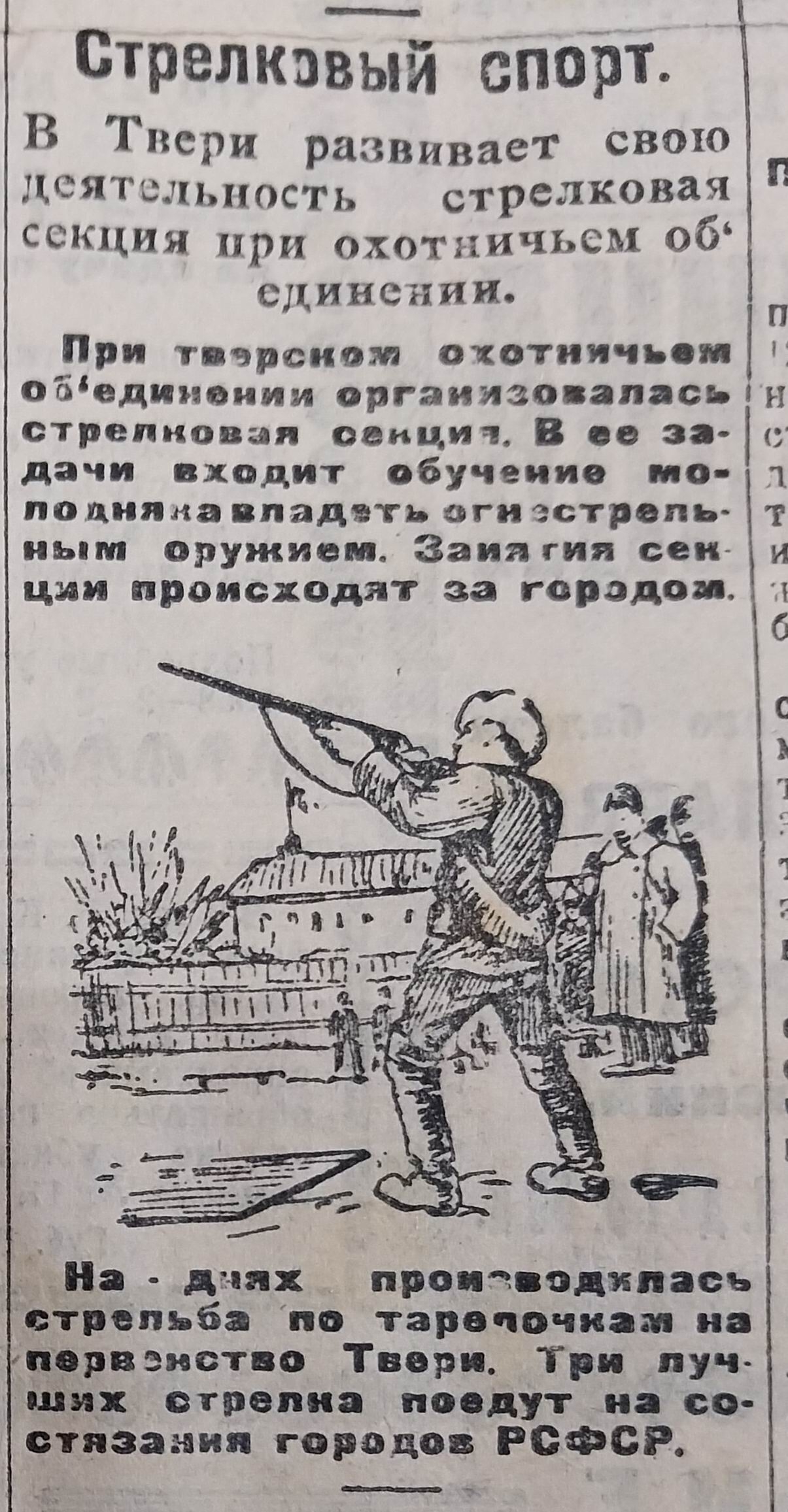 В марте «Тверская правда» сообщала, что в Твери развивается стрелковый спорт. В начале марта прошли соревнования стрелковой секции при охотничьем объединении. Занятия секции проходили за городом.