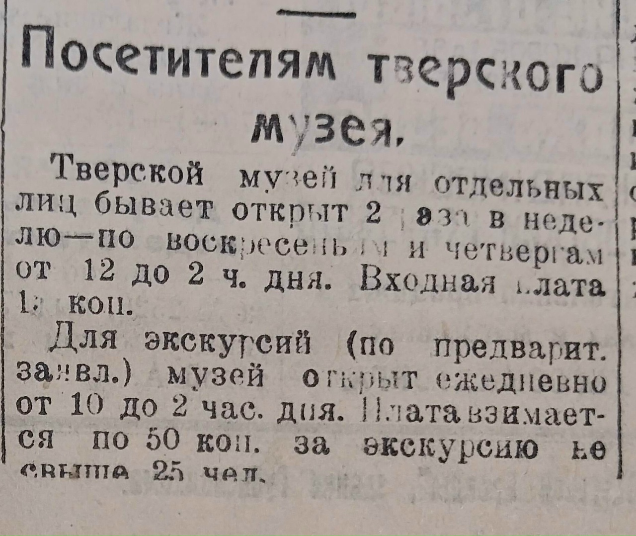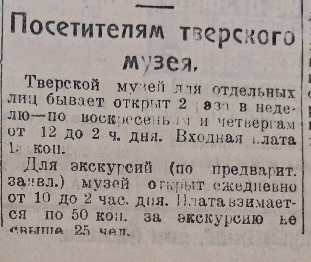 100 лет назад продолжал свою работу тверской музей, который был открыт для индивидуальных посетителей два дня в неделю с 12.00 до 14.00, а экскурсионные группы могли приходить в любой день, но по предварительной заявке.
