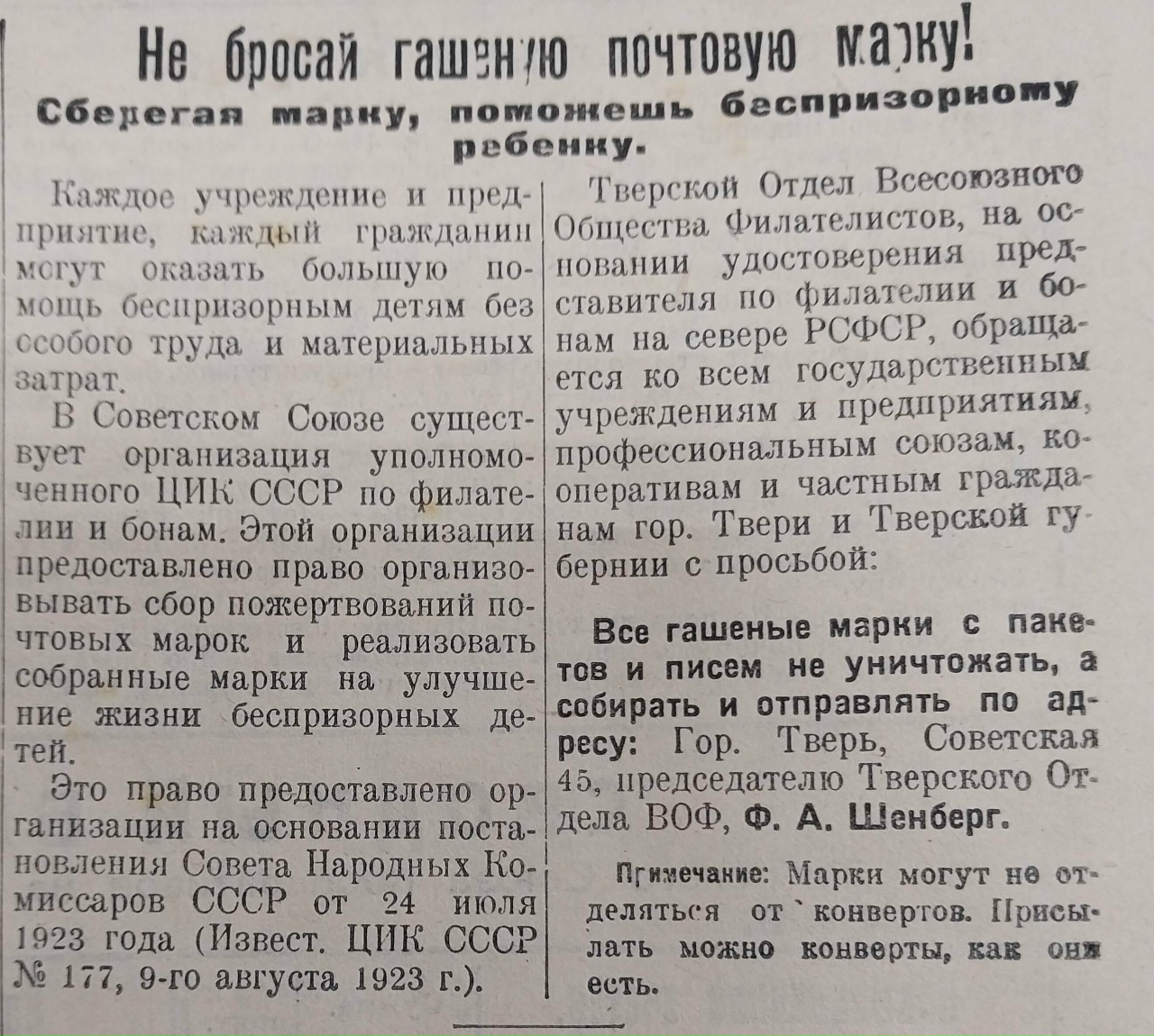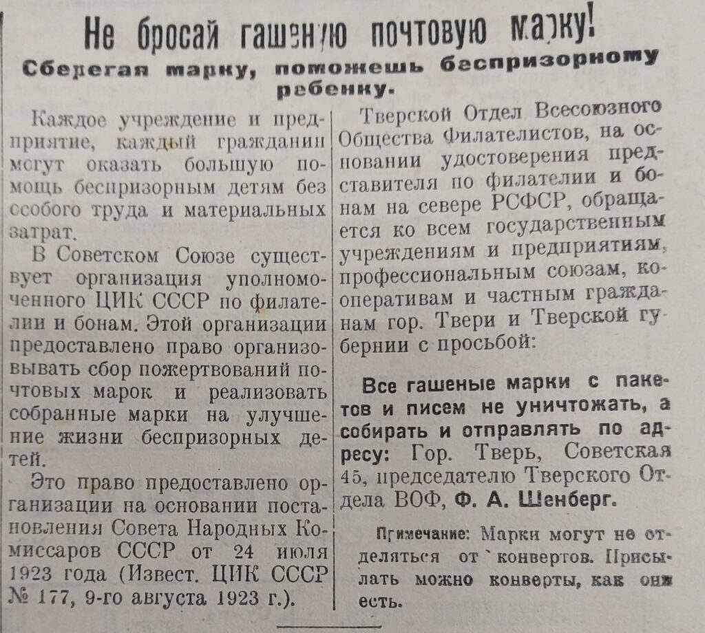 В газете за 17 марта было опубликовано обращение председателя Тверского отдела Всесоюзного общества филателистов к учреждениям, предприятиям и гражданам, с просьбой не выбрасывать гашеные марки с писем и бандеролей. В газете пояснялось, что организация, уполномоченная ЦИК СССР по филателии и бонам, имеет право собирать такие марки, а средства, полученные от их реализации, может направлять на помощь беспризорным детям.