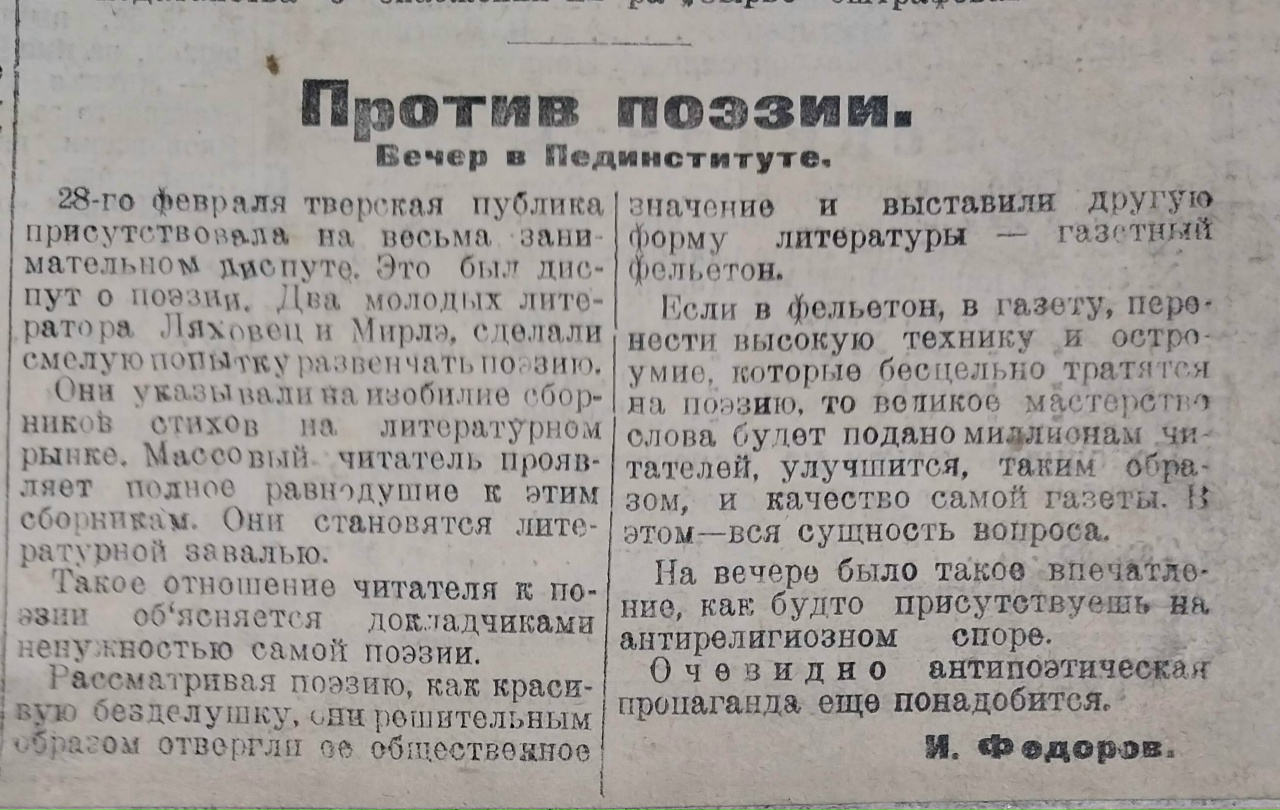 28 февраля в Тверском пединституте прошел диспут о поэзии, на котором докладчики отвергали общественное значение поэзии, рассматривали ее как «красивую безделушку».