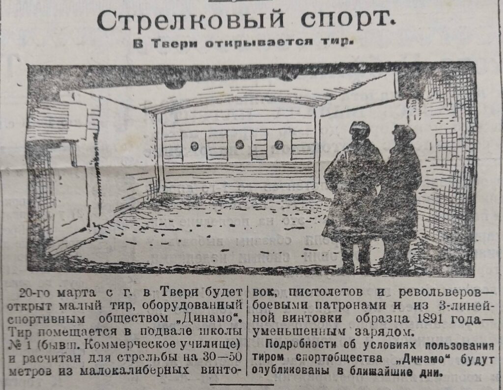 А 20 марта в подвале бывшего коммерческого училища был открыт тир, оборудованный спортивным обществом «Динамо».