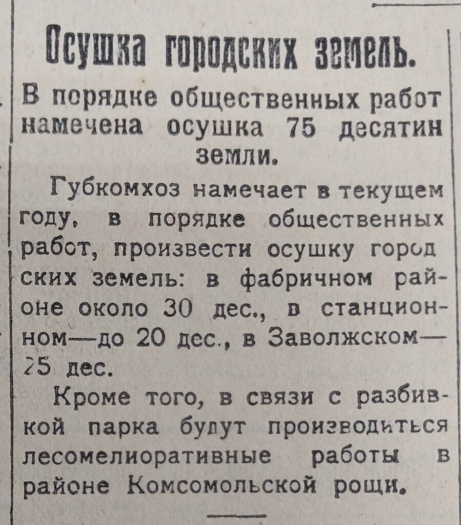 В газете за 10 марта сообщалось о планах губернского отдела коммунального хозяйства о запланированной на 1926 год осушке 75 десятин (около 82 гектаров) земли в городе Твери. Кроме того, были запланированы лесомелиоративные работы в районе Комсомольской рощи в связи с разбивкой здесь парка.